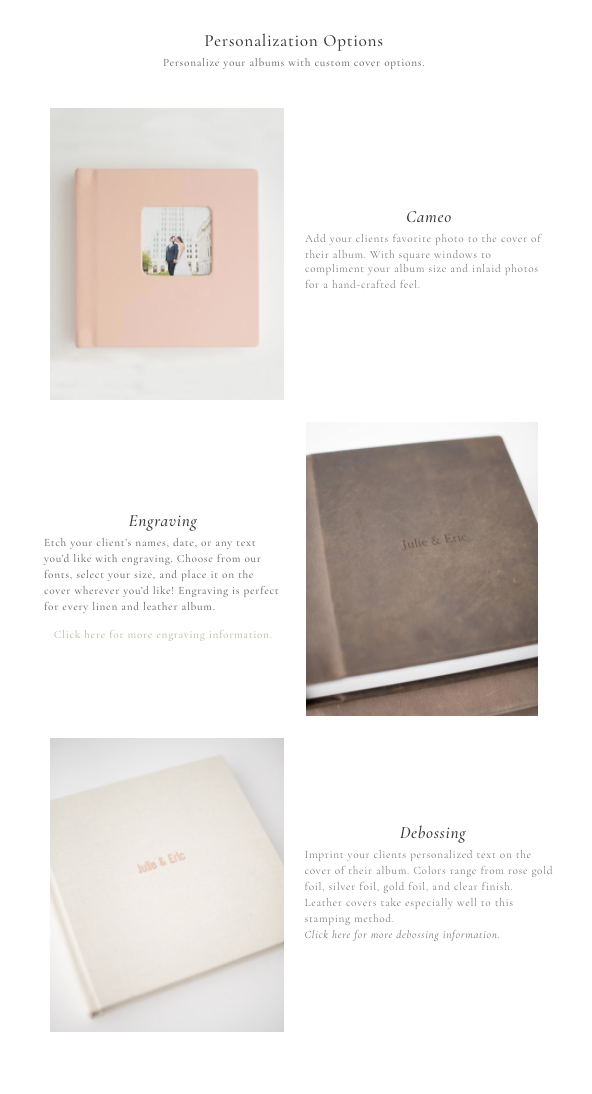 You can upgrade and add-on to your album to linen or leather albums or thick pages as well as engraving or debossing or cameo windows.