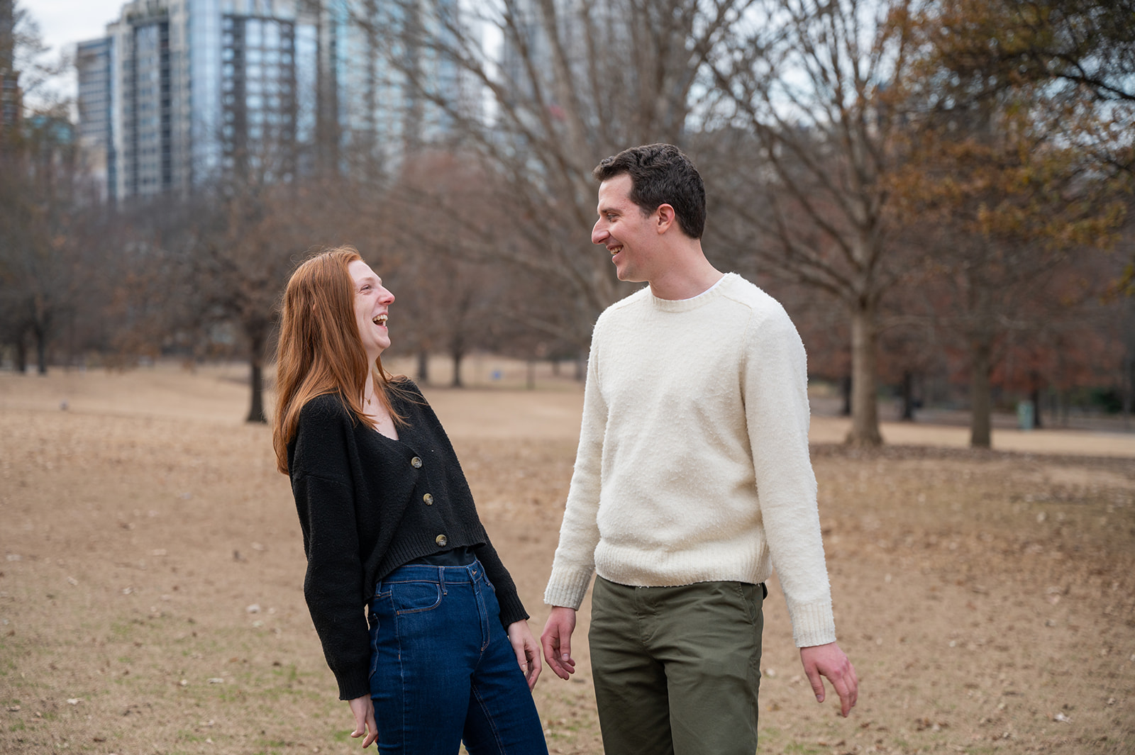 After the hugs and happy tears, we moved into a mini engagement session. They felt light and full of joy. The nerves were gone. Now they could just be together. We walked through Piedmont Park and stopped at a few favorite spots. They held hands and laughed the whole time. Marlow kept looking at Gracie like he could not believe she said yes. Gracie kept staring at her ring and then back at him. We took photos with the skyline in the back. We found tree-lined paths and soft green space. Each spot showed a new side of their story.