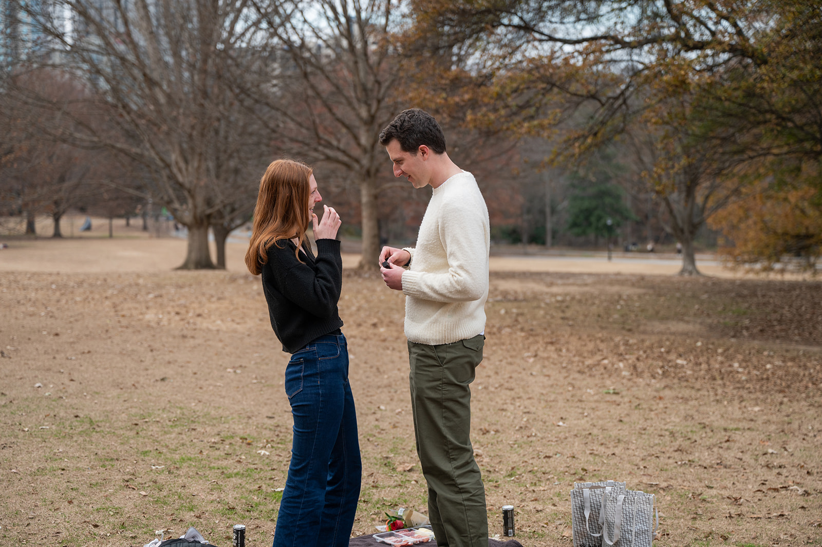 Marlow reached out to me with a clear goal. He wanted to propose to Gracie at Oak Hill Lawn in Piedmont Park. He loved the open view of the city and the quiet feel of the space. Oak Hill Lawn gave him both. We talked through every detail. We picked the exact spot for his Oak Hill Lawn proposal. We planned where I would stand so Gracie would not see me. Marlow cared about every part of this moment. He wanted it to feel calm, sweet, and true to them. On the day of the proposal, he led Gracie across Piedmont Park like it was any other walk for a picnic just the two of them. She had no idea what was about to happen.
